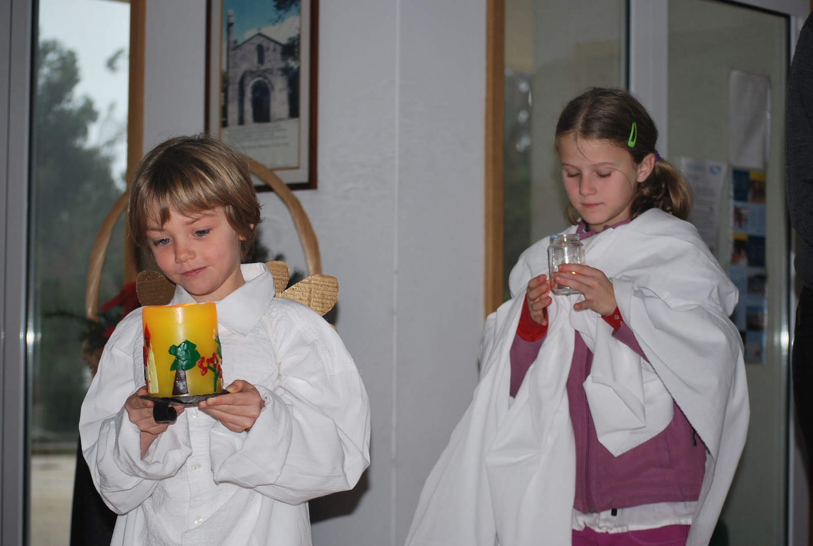 Engel müssen keine Flügel haben und darüber hinaus auch kein besonderes Aussehen oder spezielles körperliche Eigenschaften. Ganz im Gegenteil, wie eine sehr eindrucksvoll vorgetragene Geschichte über ein Adoptivkind belegte, das sogar mit einem Gipsarm sehr überzeugend den Verkündigungsengel darstellte. Es kommt lediglich auf die Botschaft und die Motivation an. Angespornt durch dieses Beispiel fertigten die Gottesdienstbesucher in Zweierteams eigene bunte Papierengel mit ganz konkreten Botschaften. Die Bandbreite war groß – von der guten Reisebegleitung für die eigene Mutter bis hin zur Mut- und Unterstützungsbotschaft für arme und hungernde Kinder in der Dritten Welt. Die Botschaften wurden laut verlesen und anschließend an einem dünnen Draht über dem Altar aufgehängt. Dort werden sie gut sichtbar jetzt eine zeitlang ihre Vermittlermission erfüllen.